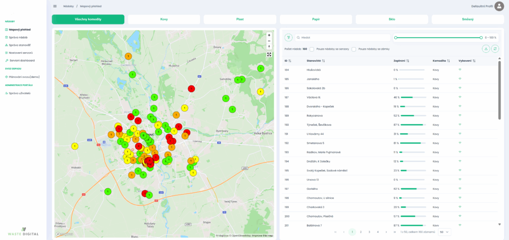 Waste Digital Platform (WDP) is a web application for cities, municipalities, and waste collection companies that centralizes all waste management data and processes in one place. It enables clear administration, advanced analytics, and reporting on production, collection, and system efficiency. The platform can be integrated with fill-level sensors, smart locks, AI monitoring, and other IoT devices. It offers detailed statistics, an interactive fill-level map, collection overviews, and centralized access management for containers.