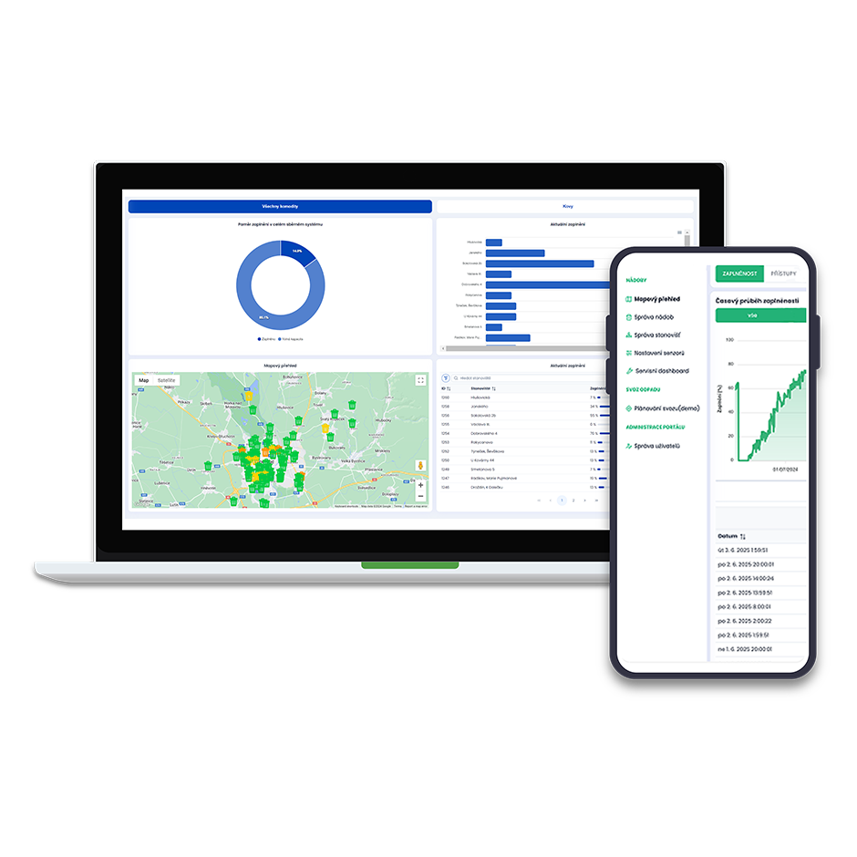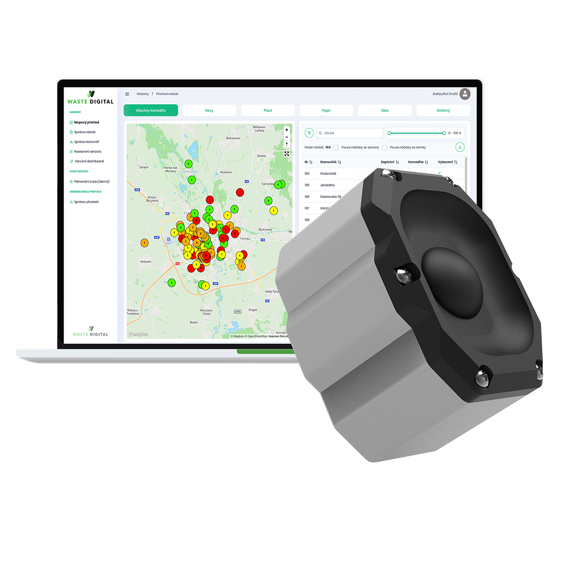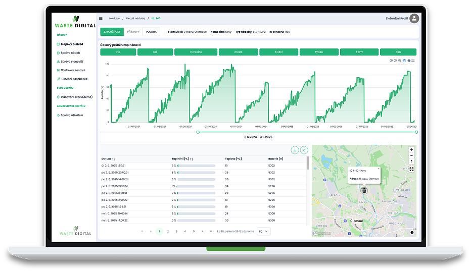 Waste Digital Platform (WDP) is a web application for cities, municipalities, and waste collection companies that centralizes all waste management data and processes in one place. It enables clear administration, advanced analytics, and reporting on waste production, collection, and system efficiency. The platform can be integrated with fill-level sensors, smart locks, AI monitoring, and other IoT devices. It offers detailed statistics, an interactive fill-level map, collection overviews, and centralized access management for containers.