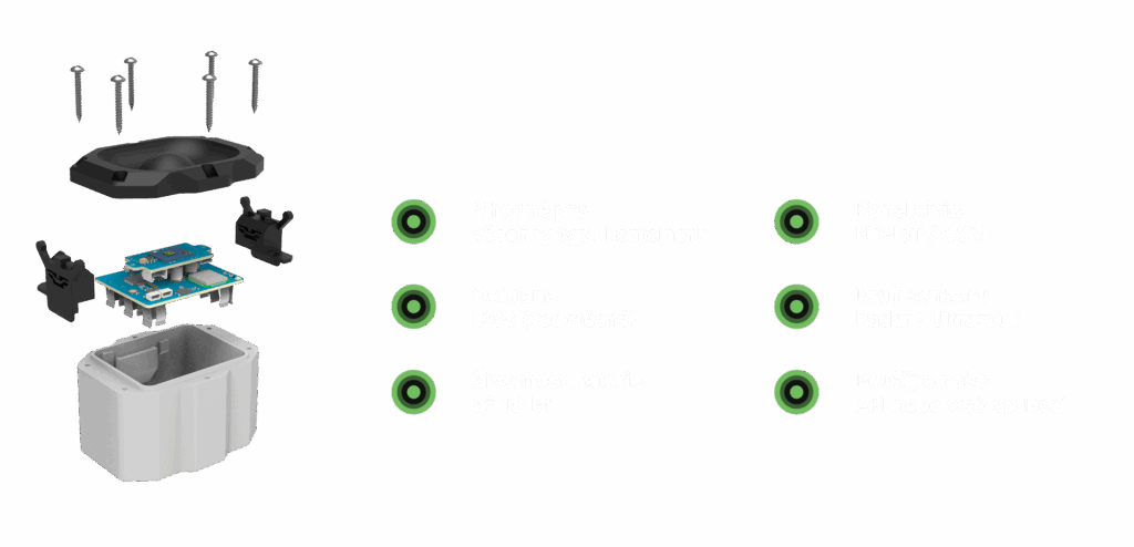 Nabízíme dvě varianty senzorů pro různé způsoby instalace. Topbee je určen pro montáž shora (např. na víko), zatímco Wallbee se instaluje na horní boční stranu nádoby. Obě verze poskytují stejné funkce měření a konektivity; volba závisí na typu kontejneru a konstrukci (nadzemní, polopodzemní, velkokapacitní) i na požadované montáži a servisu.